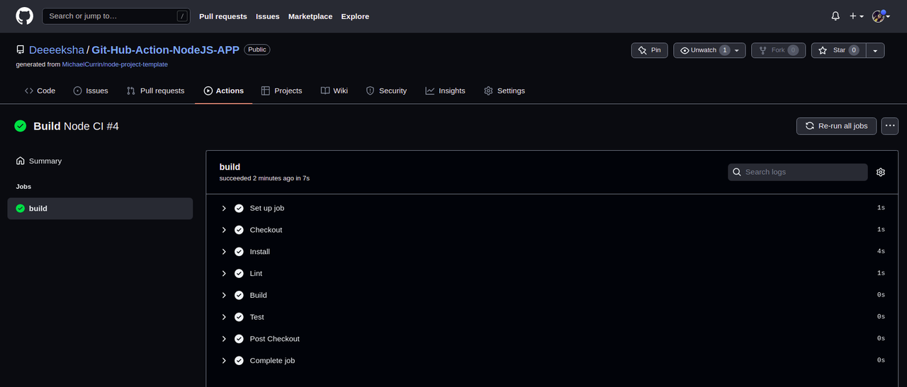 The workflow should log that it is successfully checked out your repo and then ran one step to print a greeting. Then it will finish with a green check-mark.