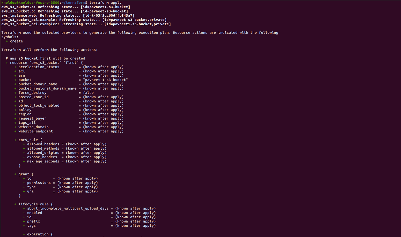 Step 5: For creating the S3 bucket, use “terraform apply”. This command is used to make the changes in the real infrastructure in order to execute the plan created above.