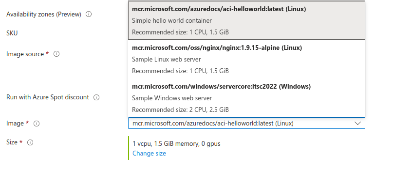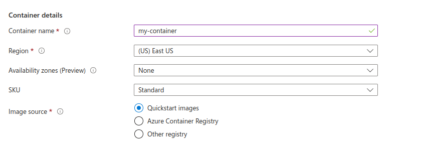 4. Provide container name. Choose region. Select image source. Quickstart images means that the image is coming from the Azure public repo.