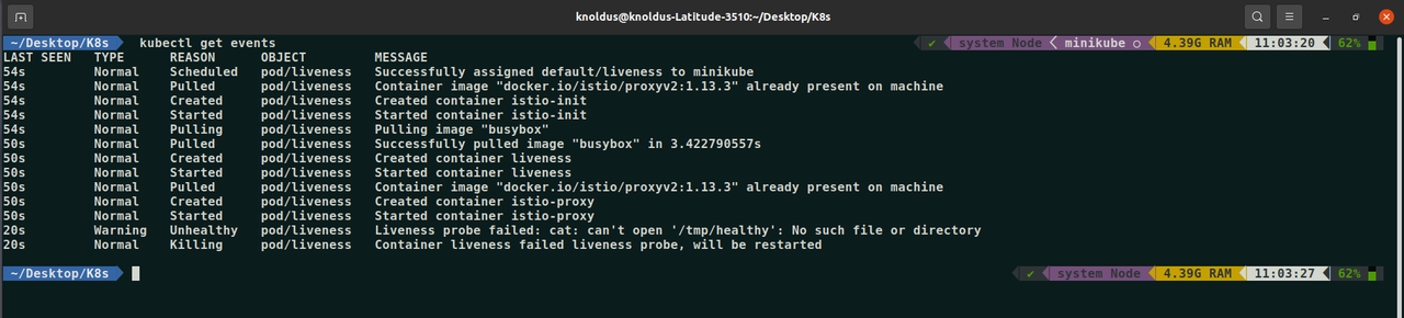 Run the below command, and you will see that the liveness probe has failed, and the container has been killed and restarted.