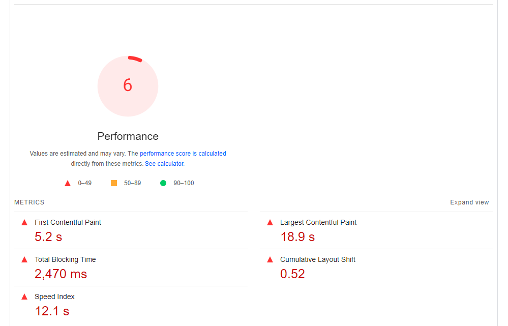 It provides suggestions to improve the site’s speed and user experience. The metrics scores and the perf score are colored according to these ranges: