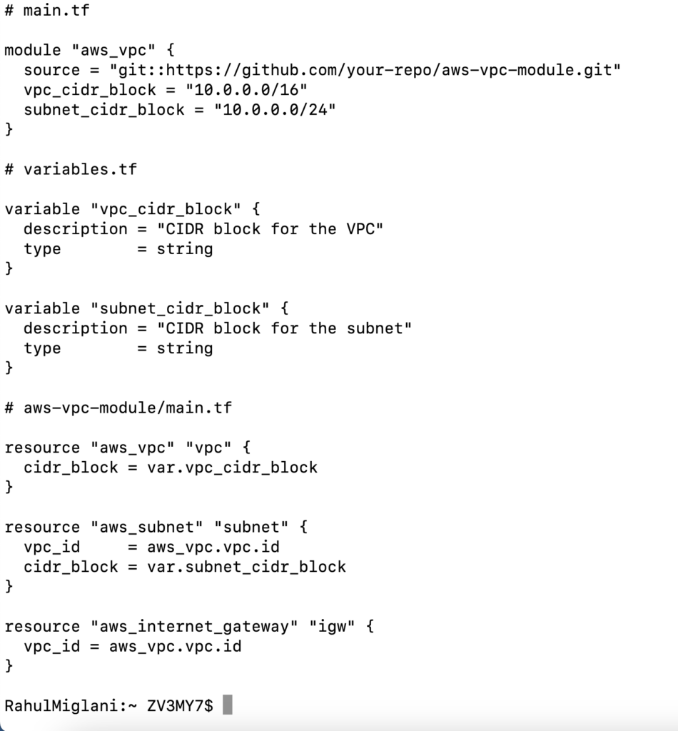 Let’s consider an example where we want to create an AWS VPC module that can be reused across multiple projects. The module will create a VPC, subnet, and an internet gateway.