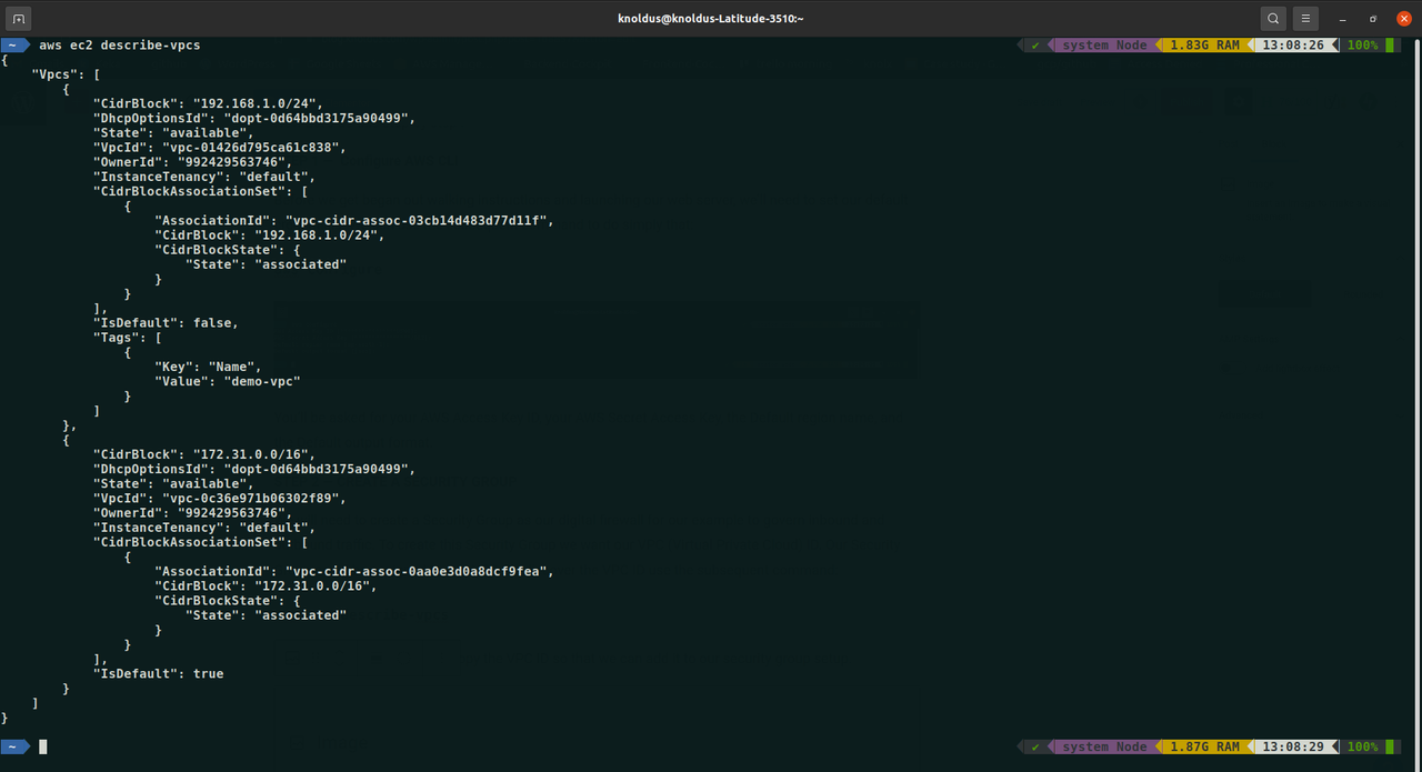We will need to create a Security Group as our digital firewall for our example to govern inbound and outbound traffic. To create this Security Group we want our VPC (Virtual Private Cloud) ID. Our Security Group could be assigned to this VPC. To discover the VPC ID use the subsequent command: