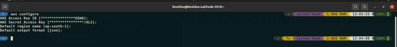 You’ll be asked for your AWS Access Key ID, your AWS Secret Access Key, the Default region name, and the Default output format.