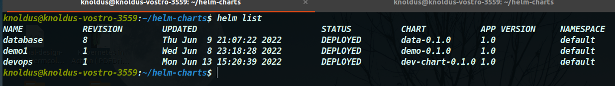 - When you do helm install, helm upgrades the changes that are applied to the existing deployment instead of creating a new one. Moreover, we can also do rollback in helm.
