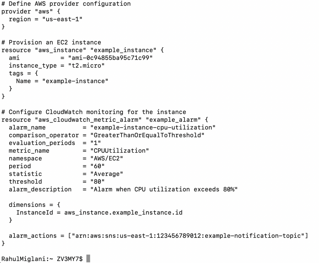 Next, we configure CloudWatch monitoring for the instance using the aws_cloudwatch_metric_alarm resource block. We define an alarm that triggers when the CPU utilization exceeds 80%. The alarm is associated with the instance by specifying its ID in the dimensions block. We also set up an action to send a notification to an SNS topic when the alarm is triggered.