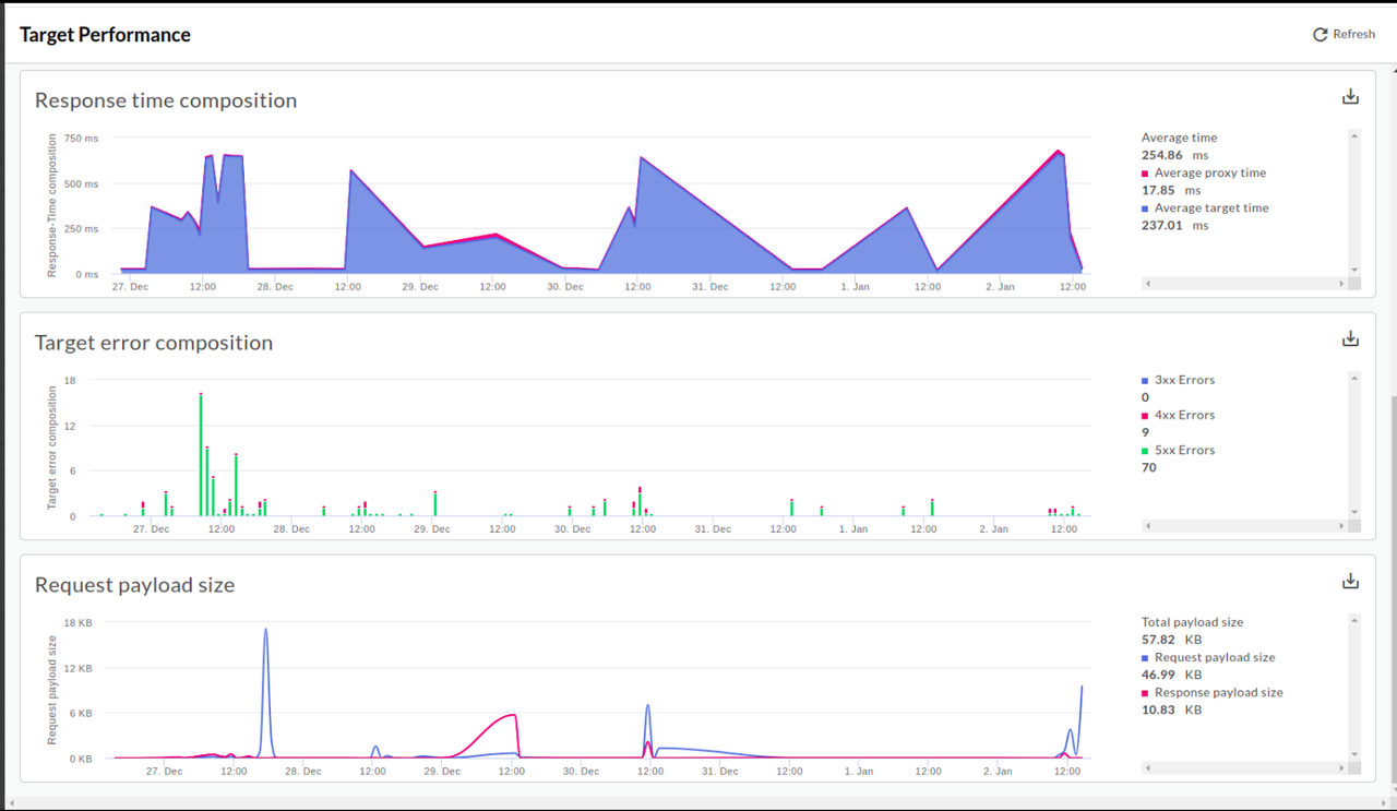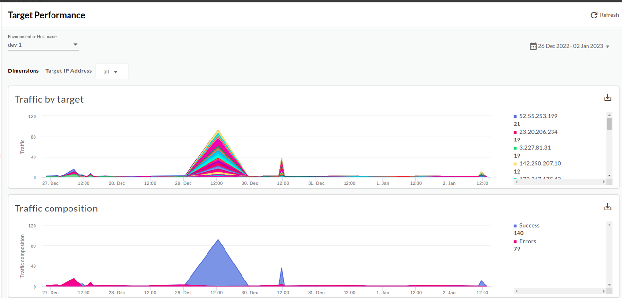 The Target Performance dashboard helps you visualise traffic patterns and performance metrics for API proxy backend targets.