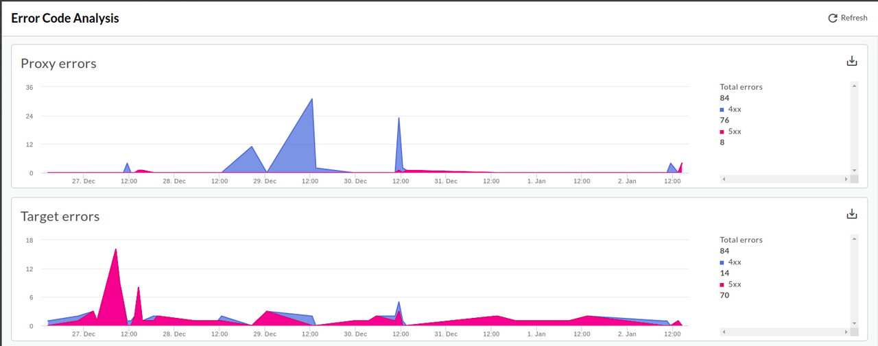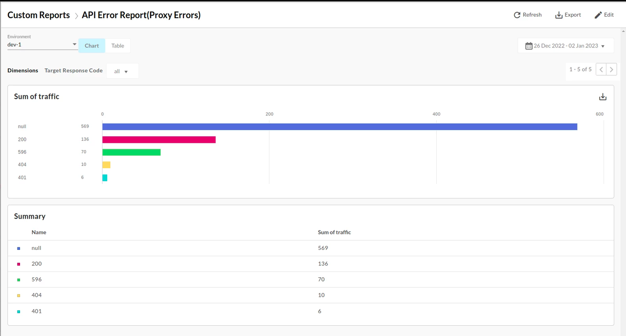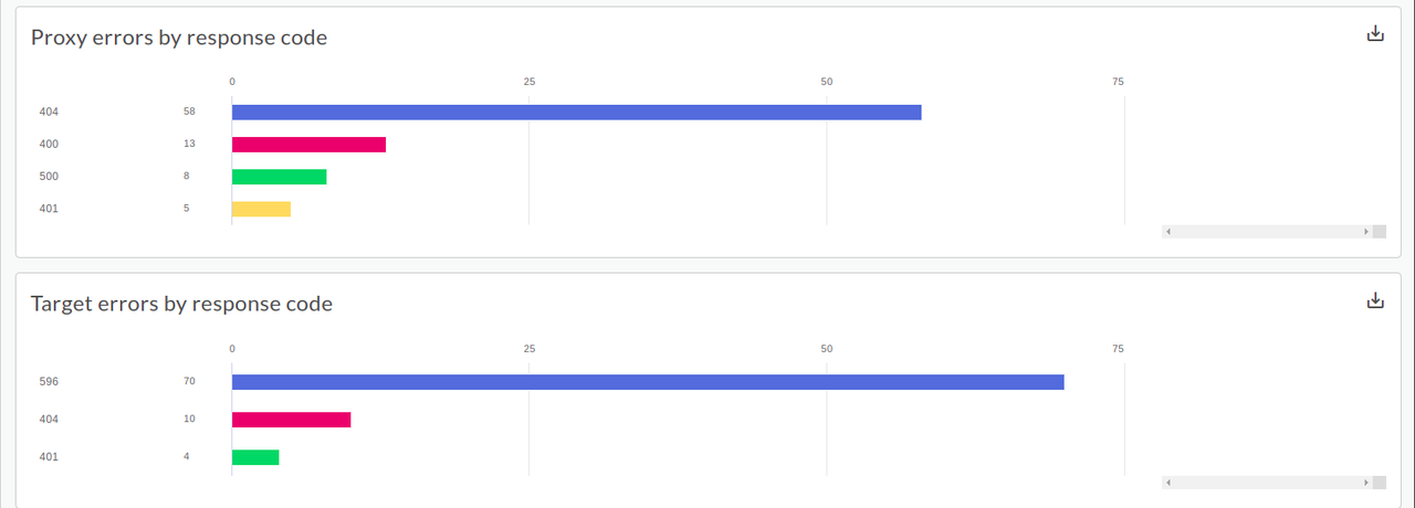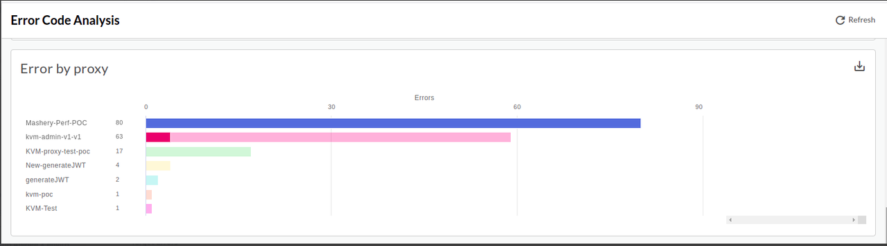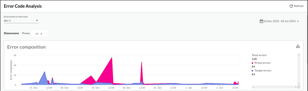 Error code analysis tells you about the amount of error rates for API proxies and targets. The Error Code Analysis dashboard uses: