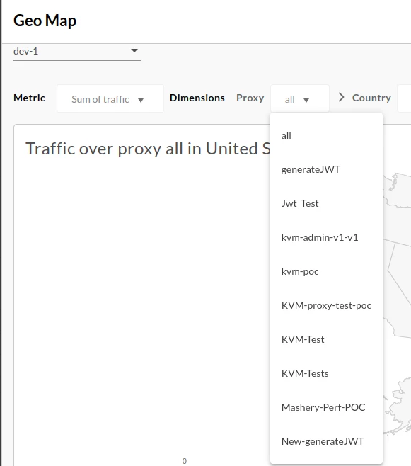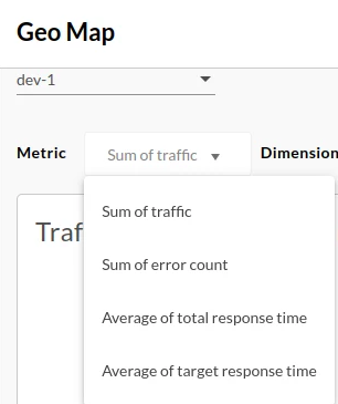 The Geo Map dashboard tracks traffic patterns, error patterns, and quality of service across geographical locations.