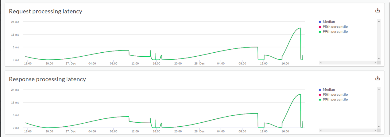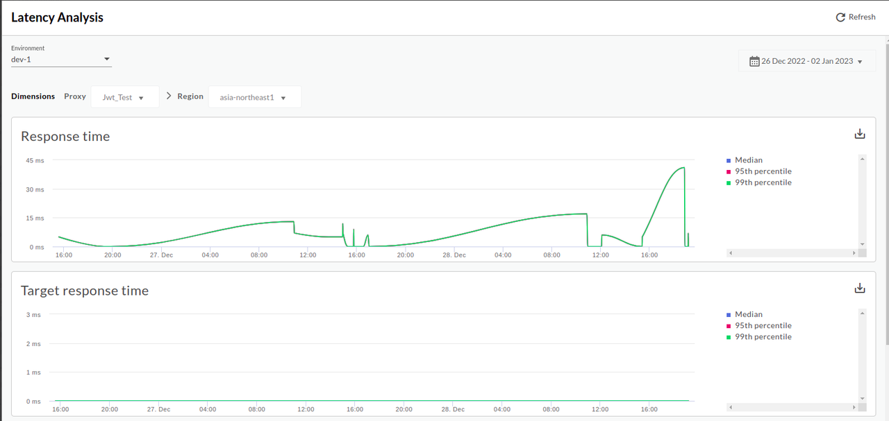 The Latency Analysis dashboard can alert you to any latency issues your API proxies may be experiencing. It displays latency measurements down to the window of a minute, highlighting the median, 95th percentile, and 99th percentile values.