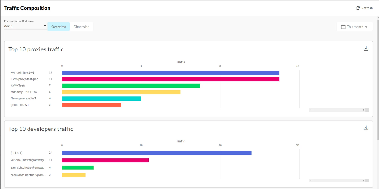 This dashboard helps us to see API proxy traffic patterns and processing times.It also helps us in visualizing how much traffic APIs generate how long  it takes for API calls to be processed.