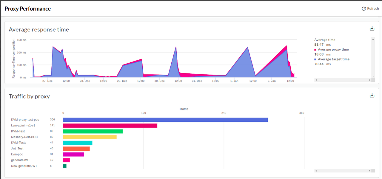 The above image shows the last 7 days of Proxy Performance of all the Proxies .This dashboard includes these charts: