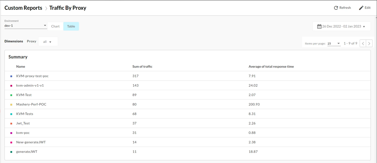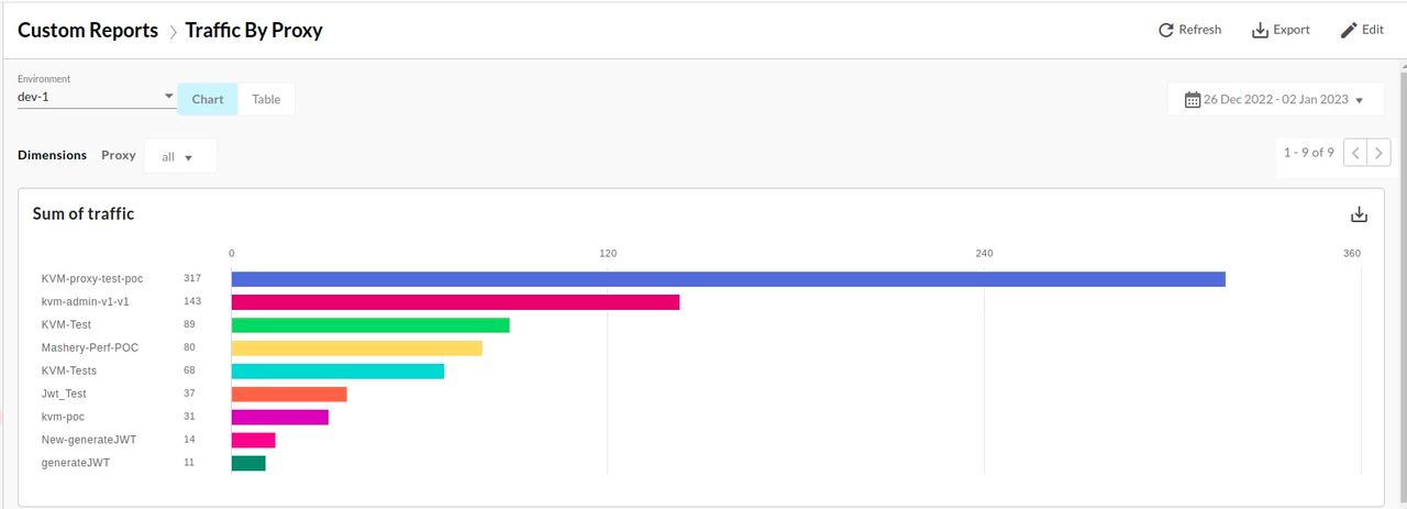 It means that the Total number of API calls processed by Apigee in the specified time period. THe traffic by proxy custom reports generates data as :