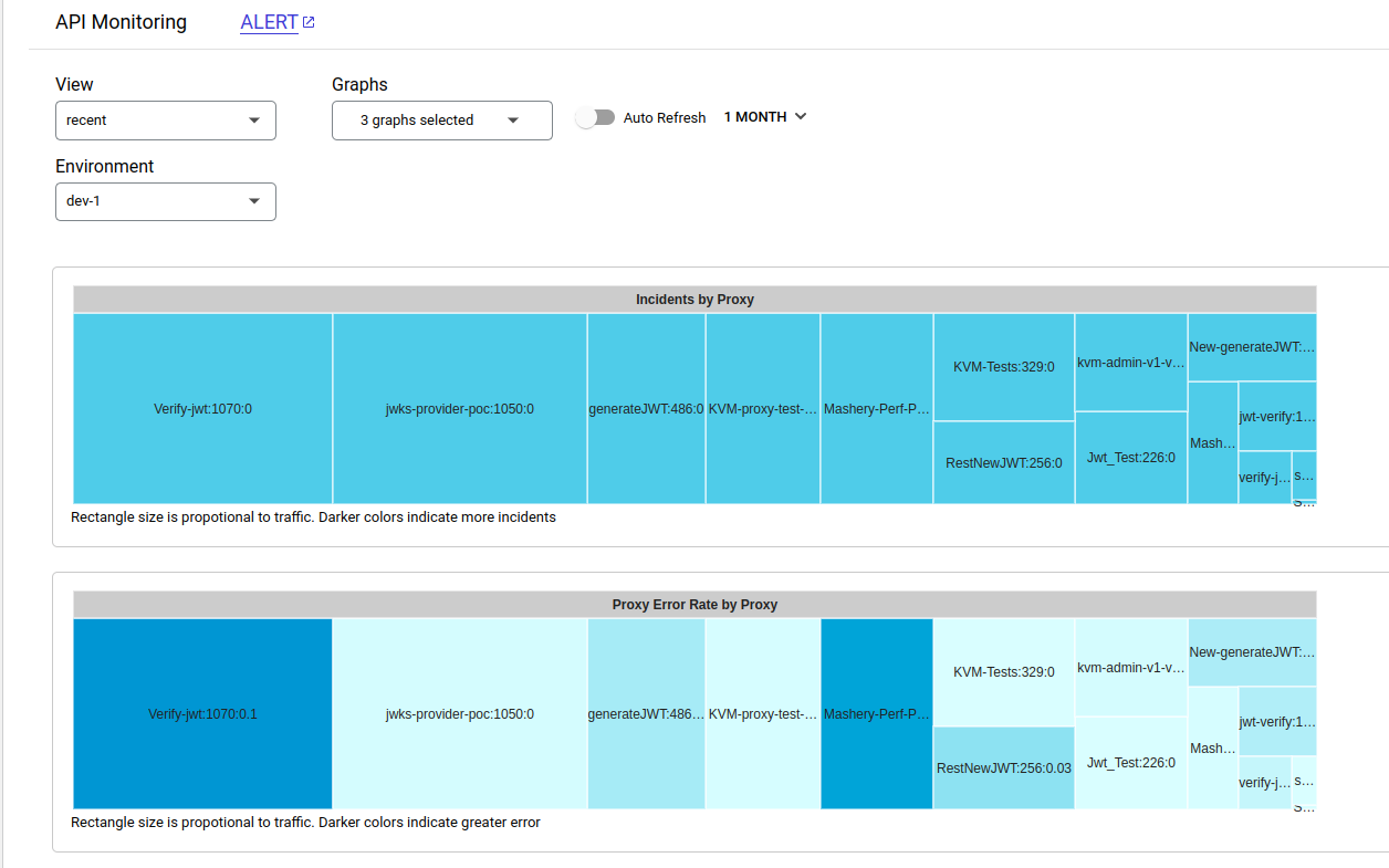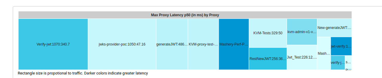 • Recent: Displays treemaps of data in which each proxy is represented by a rectangle, whose size is proportional to the amount of API traffic for the proxy, and whose color denotes the relative size of related metrics.
