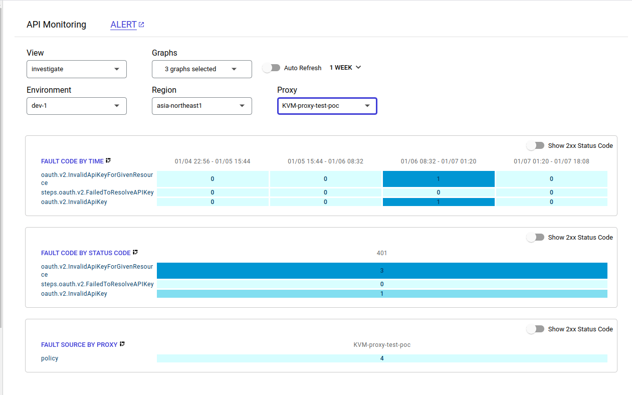 • Investigate: Displays tables of API traffic data, such as fault code by region.