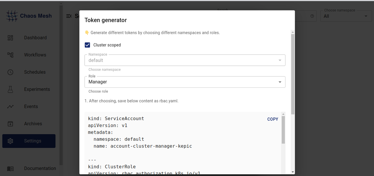 Now, select cluster scoped and role as manager and then copy the RBAC.yaml file and apply that file in the terminal.