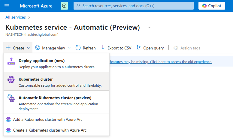 - Login to Azure Subscription. Search for Kubernetes service.