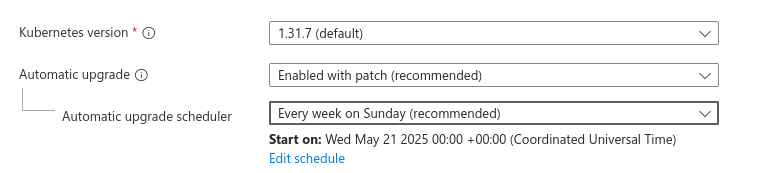 5. Select kubernetes version. We are taking here default one. We can also configure kubernetes cluster upgrade.