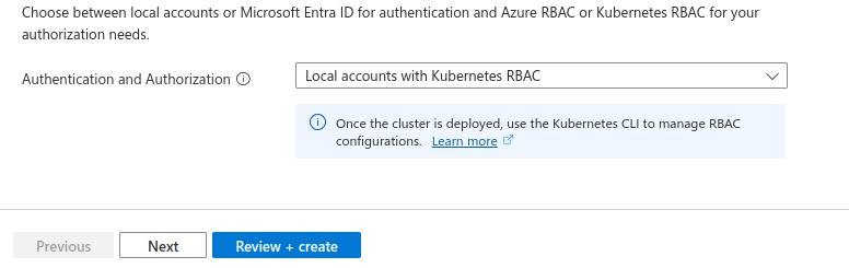 6. Now, choose between local accounts or Microsoft Entra ID for authentication and Azure RBAC or Kubernetes RBAC for your authorization needs