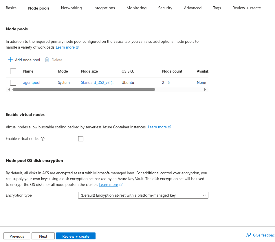 Click on Next. Now, let’s configure cluster node pools here. In AKS, a node pool is a group of virtual machines (nodes) with the same configuration (VM size, OS, etc.) that run your containerized workloads.