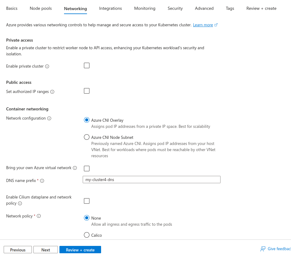 Also choose container networking and network policy.
