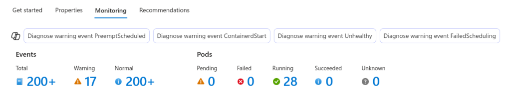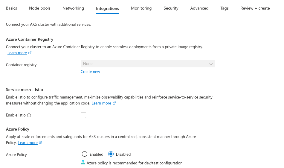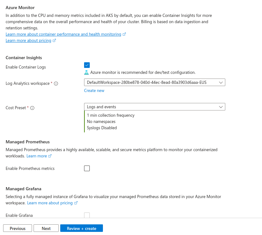 So, for monitoring of our AKS cluster, we can utilise and configure here Azure Monitor. Easily enable it for container logs. We also have here options for configuring Prometheus and Grafana for monitoring cluster.