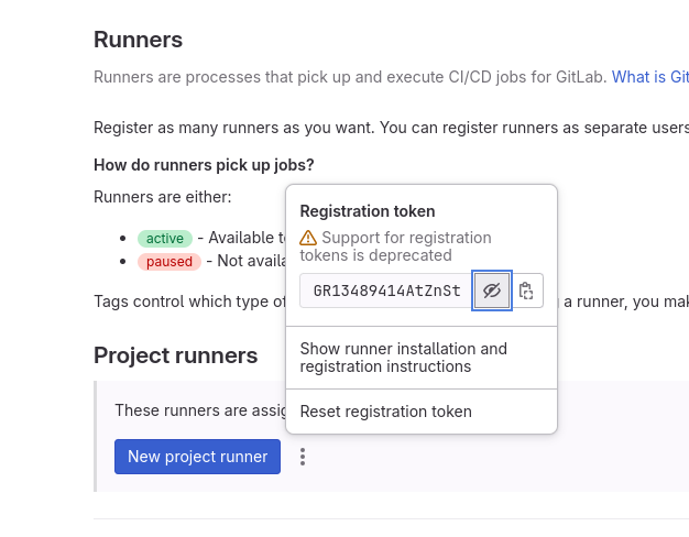 You will found registration token here – Settings > CICD > Runners > Project Runners.