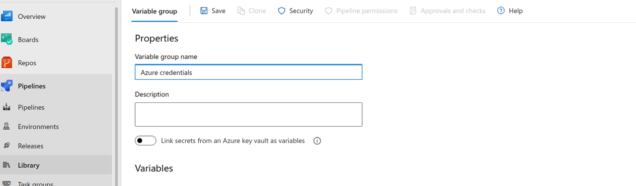 As we need a few credentials or secret IDs or passwords in the pipeline. So we can not add them to the pipeline directly. So we will use the variable group for that. We will define them in the variable group and call them into the pipeline. You can create your variable group from here.
