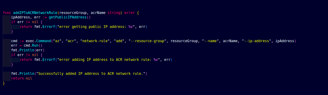 In this section, we will define all the functions that are required for the terratest test cases. First, we will fetch the IP address to configure the private ACR, then add that IP to the private ACR and then docker login and push the image.