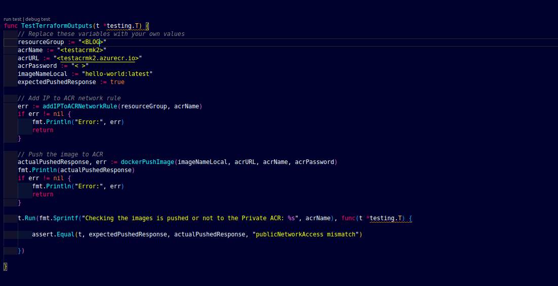 You can change every single value of the variable and you need to pass the password also of your private ACR which will be used while we login to the ACR. In this function, We are also run the test case where we compare the expected value with the actual values.