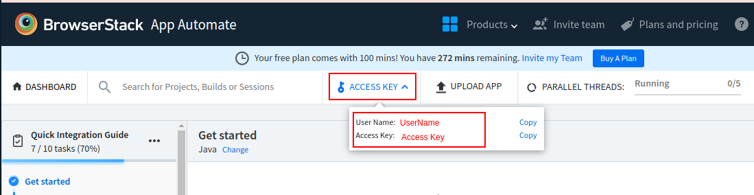 - Obtain Username and Access Key: After signing up, you will be provided with a unique username and access key. These credentials are required to establish a connection between your test scripts and the BrowserStack cloud.