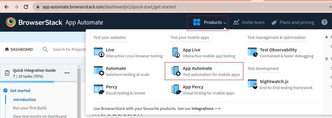 To begin the setup, first, you must register for a free trial or purchase a plan to obtain your access credentials. After completing those steps, you can proceed to launch BrowserStack App Automate, and as a result, you will be directed to the following page.