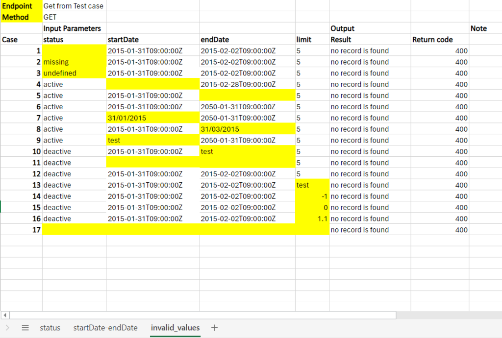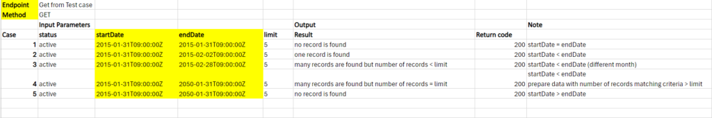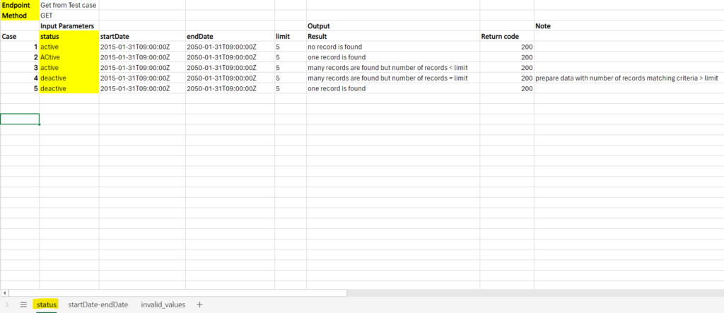 Now let’s look at an example of preparing test data for REST API with the GET method with parameters: status, startDate, endDate, limit below: