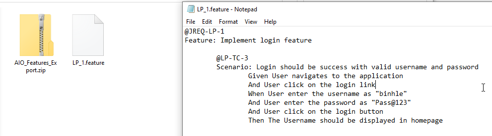 Feature file: Rename the feature file which exported from AIO Test to login.feature and copy it to automation framework.