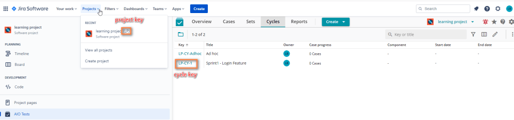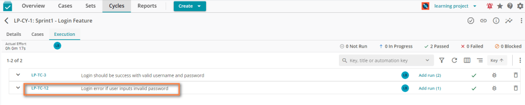 We also created an empty test cycle: LP-CY-1
