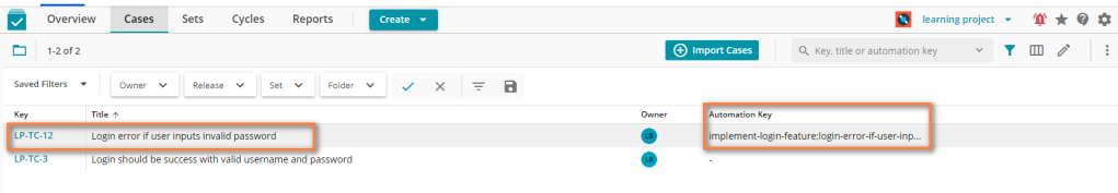 Notice that the new test case uses the value ‘implement-login-feature;login-error-if-user-inputs-invalid-password’ in ‘Automation Key’ field for mapping to automation test scenario, its value can found in JSON report, field ‘id’.