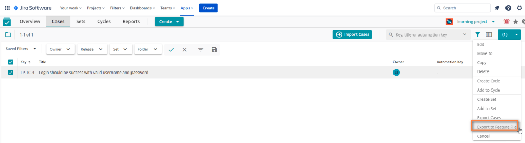 AIO Test supports exporting scenarios to a feature file (and import an existing feature file to test cases as well), select the login test case above and export it from option menu: