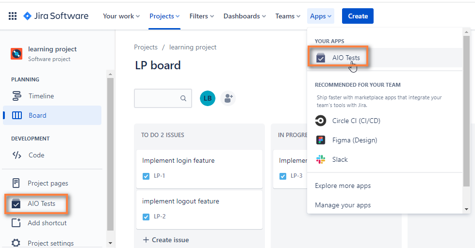 After installing successfully, you can access the AIO Test by left menu ‘AIO Tests’ or from top menu ‘Apps’.