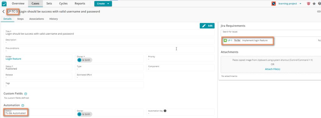 • Feature name ‘Implement login feature’: The name same as the Jira requirement that the test case is linking.