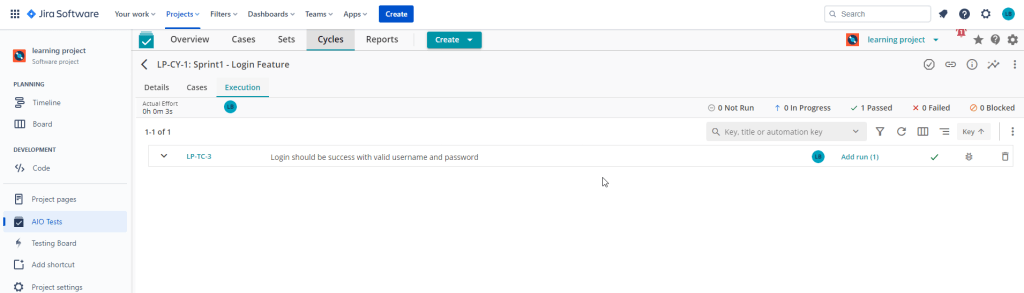 Go to AIO Test and check the result, you will see the test ‘@LP-TC-3’ was added cycle ‘LP-CY-1: Sprint1 – Login Feature’ and it also updated the test result as passed. The test case exists in AIO Test but it did not add to the cycle before the automation test run, the import result API was added it to cycle thank to the parameter in request: bodyFormData.append(“addCaseToCycle”, “true”);