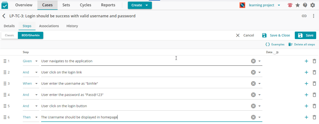 AIO Tests support writing test cases in classic or BDD format, for example, I have a test scenario to login success to the bookcart website https://bookcart.azurewebsites.net/login as the image in the right side.