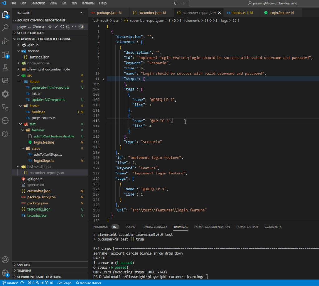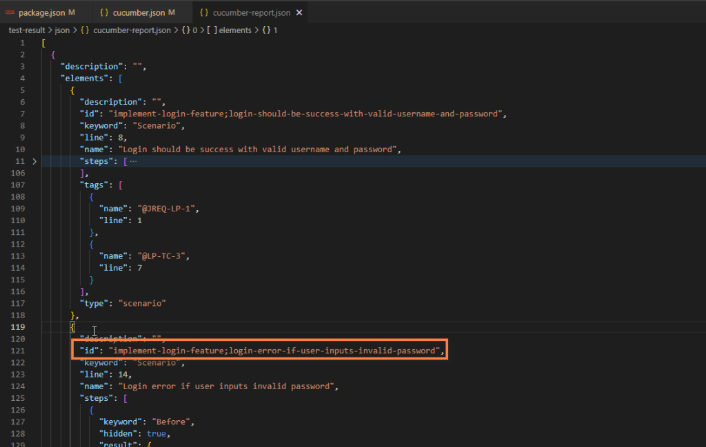 After the test finish, a ‘cucumber-report.json’ was generated in test-result/json folder.