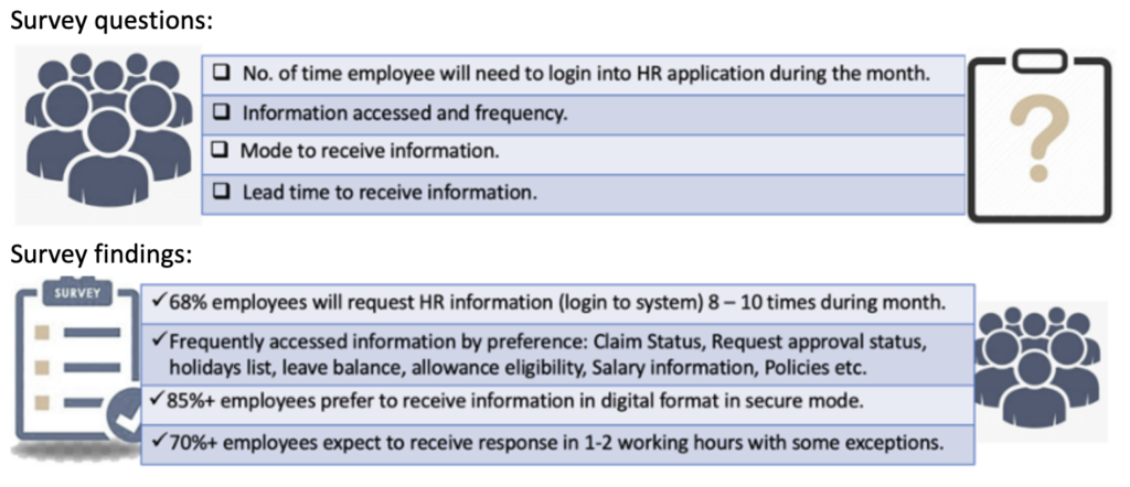 The organization was deliberating having Self Service licenses procured for each employee Vs Managed HR Helpdesk to respond to employee information requests.  An organization-level survey was conducted to make a decision on Managed Help Desk Vs Employee Self Service Application licenses Vs other options.