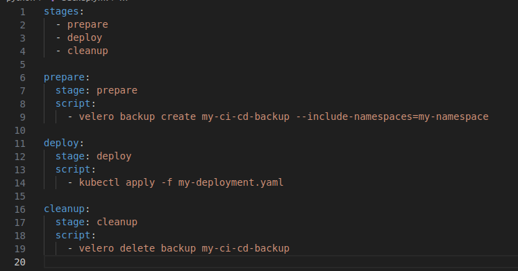 Depending on your CI/CD tool (Jenkins, GitLab CI, GitHub Actions, etc.), you can integrate the Velero commands into your pipeline configuration. Here’s a generic example using YAML syntax for GitHub actions, which might be adapted for your specific CI/CD tool: