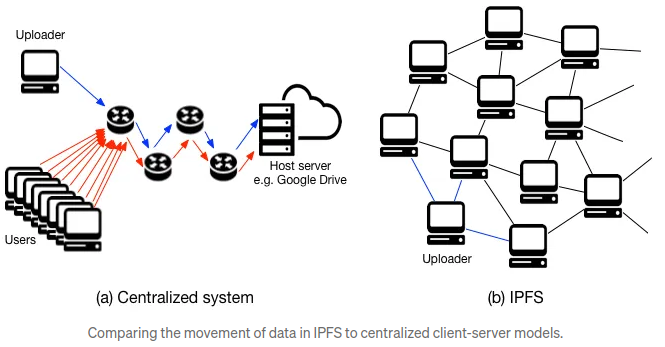 - IPFS: Utilizes a decentralized peer-to-peer (P2P) network. There are no central servers. When you request data, the network locates nodes that hold copies of the data and retrieves it from them.