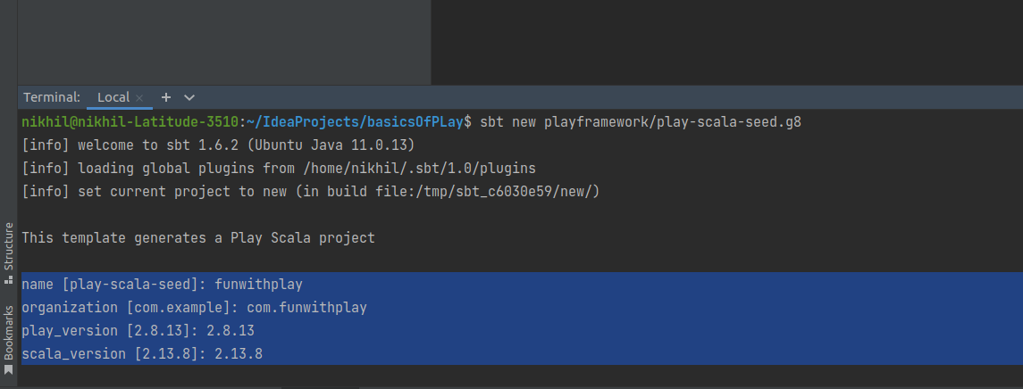 It load all the dependencies, once dependencies loaded then It will ask you to give project name, organization name like com.example, play framework version and Scala version. Enter all the details and execute.