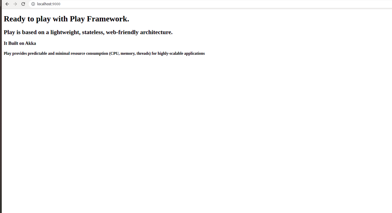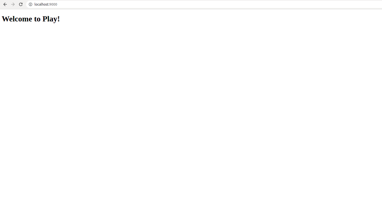 The first time we run the project It may take some time, as it compiles and builds the libraries. Once it is started, we can open it with the URL http://localhost:9000 in the browser and we will get the welcome page.