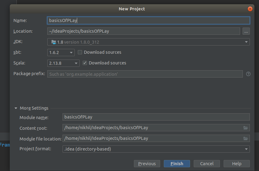 Enter project name basicsOfPlay and select sbt, scala and java version as in the below snap: