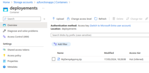 You can see ZIP file has been upload to the Azure Portal in the storage account name “azfunctionapps” under the deployment container.