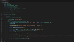 Open the created function file located under “MyFunctionApp/MyHttpTrigger.cs” file. It should look like this: